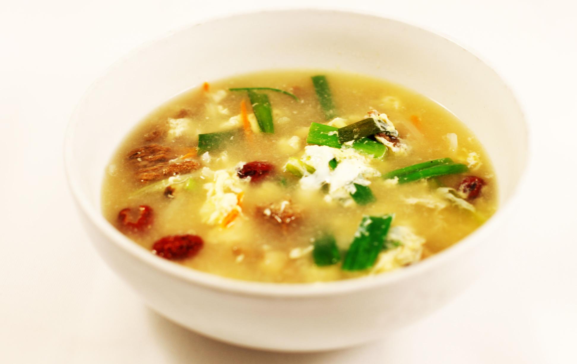 Beef broth with clear noodles, onions, garlic, egg, shitake mushrooms, carrots, and dried dates.